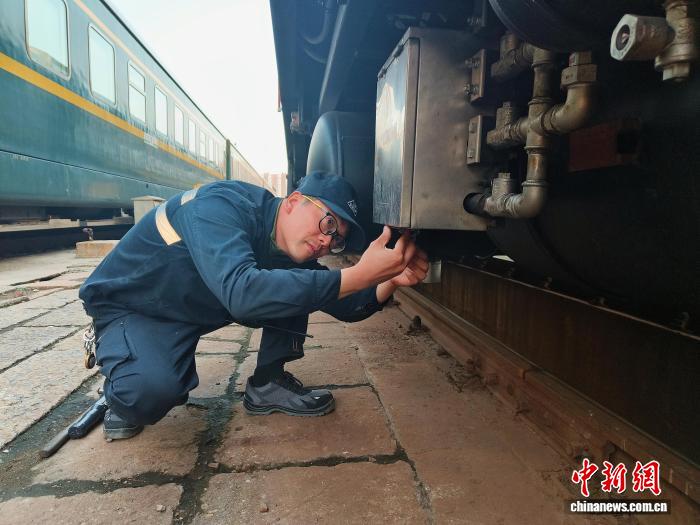 图为郑州车辆段检车员对于车上效劳办法电温器停止检验。 刘雨 摄